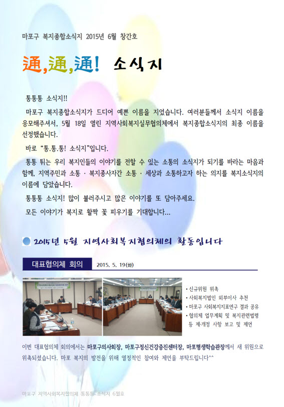 소식지는 마포구 지역 내 민간·공공의 복지관련 소식 행사 자원 등을 홍보하고 공유함으로써 복지종사자의 결속력을 높이고 복지기관간의 네트워크를 강화하기 위해 복지종합소식지 발간했다.
