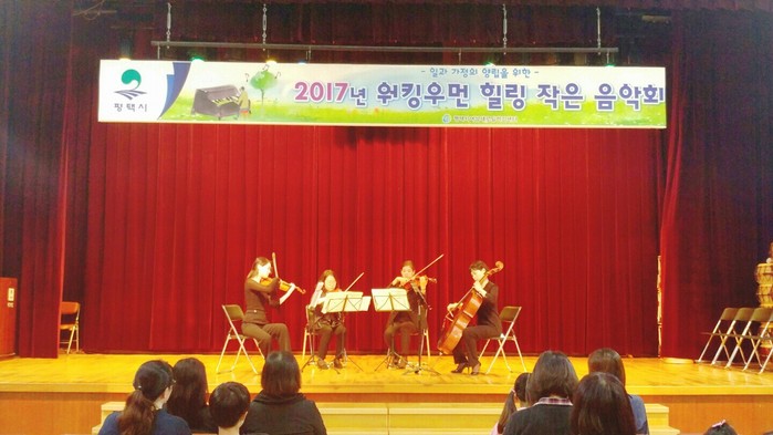 이번 ‘워킹우먼 힐링 작은 음악회’는 현악 4중주로 펼쳐지는 친숙한 클래식선율로 구성된 작은 음악회로 직장과 가정생활의 병행에 따른 스트레스를 해소하고 새로운 재충전의 기회를 주기 위해 마련됐다.