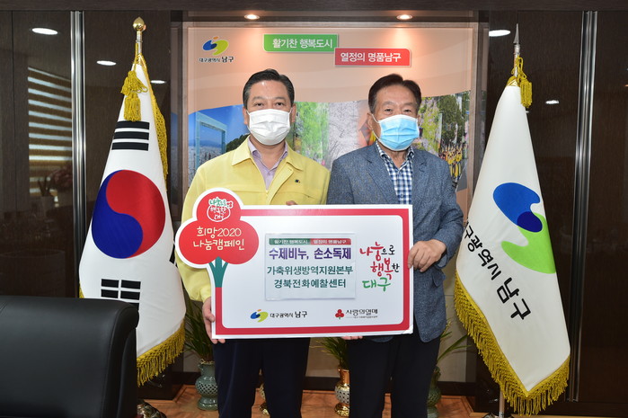 [로컬세계 박세환 기자]대구 남구청은 지난 11일, 가축위생방역 지원본부 경북도 본부 전화예찰센터(사무국장 김병일)에서 어려운 이웃을 위해 사원들이 재능나눔으로 직접만든 수제비누 200개, 수제손소독제(60ml) 300병을 전달했다고 12일 밝혔다. 이날 전달된 수제비누와 손소독제는 관내 사회복지시설을 통해 생활이 어려운 저소득 세대 등에 전달될 예정이다.