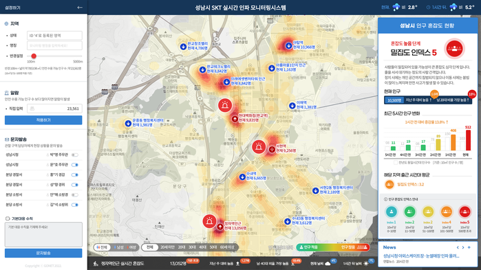 성남시에서 추진하는 인구 밀집(급증) 대응 체계는 SK텔레콤의 5분 단위의 실시간 유동 인구 빅데이터를 활용하여 전국 최초로 시 전역에 대한 지속적인 모니터링을 제공한다. 이를 통해 재난안전부서 및 관계부서에서 성남시의 인구 밀집 현황을 실시간으로 분석해 대응이 필요할 것으로 예상되는 관심 지역에 대해 관계 담당자가 파악할 수 있도록 알려주며 현장에서 실시간 상황 확인 및 처리 대응을 지원할 예정이다.