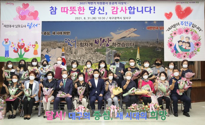 [로컬세계 박세환 기자]대구 달서구는 지난달 31일 달서구청 2층 대강당에서 우수자원봉사자 23명이 참여한 가운데 '2021 하반기 자원봉사 유공자 시상식'을 개최했다고 1일 밝혔다.