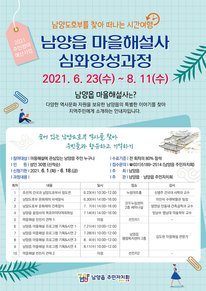 김문수 남양읍장은 “남양읍 주민자치회 기획으로 작년 처음 추진한 마을해설사 양성과정이 좋은 평가를 받아 올해 연속으로 심화과정을 추진할 수 있었다”며 “남양읍의 역사와 문화를 널리 알릴 수 있는 계기가 되길 바란다”고 말했다.