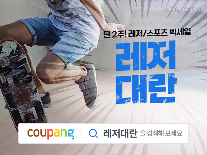 또 고객의 편리한 쇼핑을 돕기 위해 할인전 페이지에는 ▲캠핑, 수영, 야외 스포츠, 헬스용품 등 특가제품 코너 ▲골프, 라켓스포츠, 자전거, 스포츠 의류 등 카테고리별 테마관 ▲인기 브랜드별 제품을 쇼핑할 수 있는 브랜드관 등이 마련됐다. 더 자세한 사항은 쿠팡 앱에서 ‘레저대란’을 검색하면 확인할 수 있다.