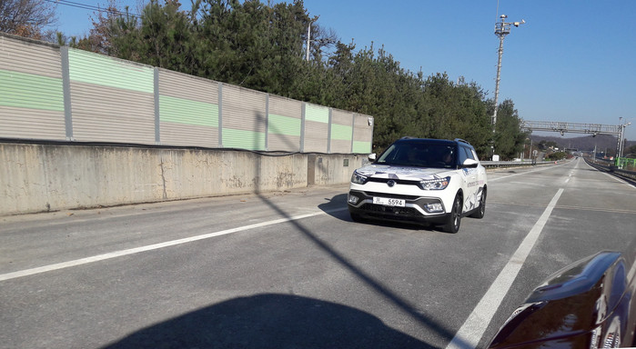 ▲쌍용차는 지난해 11월 경기도 여주 한국도로공사 기술시연도로에서 진행된 국토교통부 주관 미래형 도로시스템 기반의 자율 협력 기술 시연에 참여해 자율주행차 기술 시연을 성공적으로 마무리 했다. 사진은 기술 시연에서 선보인 쌍용자동차 티볼리 에어 기반의 자율주행 자동차의 모습. |