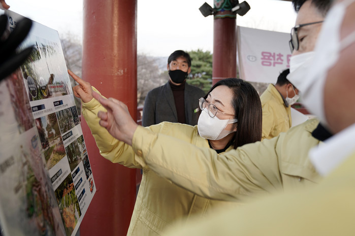 | ▲은 시장이 제1공단 근린공원 공사 추진 현황을 브리핑받고 있다. |