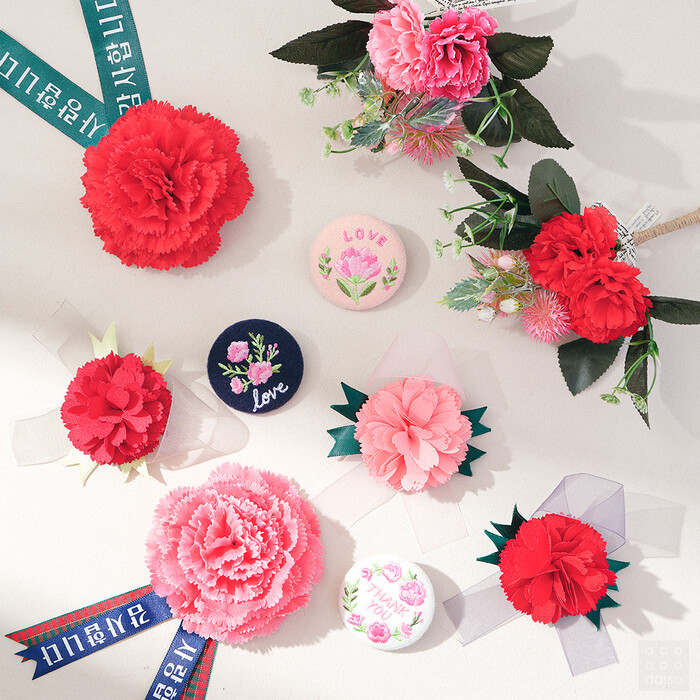 카네이션은 향이 진하고 다년생 식물인 ‘오스카 카네이션’종으로 준비했다. 레드, 체리, 투톤핑크 등 총 6가지 색상의 카네이션을 기획했고, 화분갈이를 통해 관리를 해주면 보다 길게 카네이션을 즐길 수 있다. 카네이션 코사지와 브로치는 총 10여 종이며, 다양한 크기와 디자인으로 받는 분의 취향에 맞게 선택하는 것이 좋다.