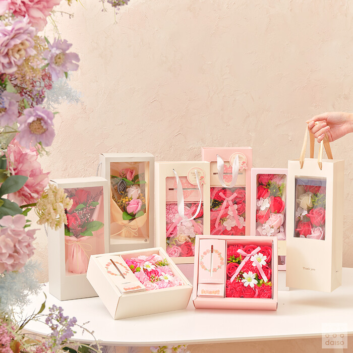 포장용품은 꽃다발이나 화분을 담을 수 있는 쇼핑백을 신상품으로 기획했다. ‘클리어 플라워 쇼핑백’은 투명한 재질의 쇼핑백이며, 두 가지 사이즈로 판매한다. 꽃다발이나, 화분, 인형 등을 크기에 맞게 선택을 하면 된다. ‘투명창 와인백’은 와인병을 넣어 선물하기 좋고, 이번 기획전에서 판매하는 ‘비누꽃 꽃다발’도 담을 수 있는 사이즈로 함께 구매하면 더 고급스런 선물을 만들 수 있다.