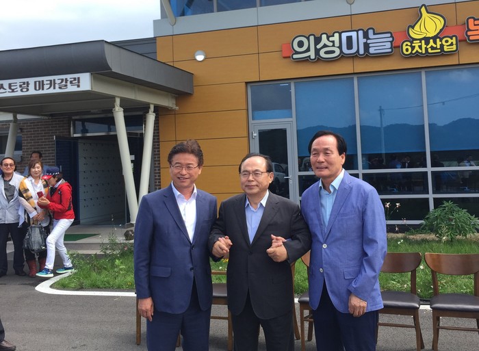 | ▲지난 16일 오거돈 부산시장은 의성읍 원당리 ‘의성마늘 6차산업 복합체험센터’를 찾아 이철우 경북지사, 김주수 의성군수와 만남의 시간을 가졌다.(의성군 제공) |