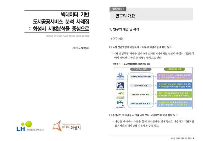 이 사례집은 지난 2014년부터 2018년까지 화성시 전역을 분석한 자료로 빅데이터 기반의 도시문제 해결방안을 마련하는 동시에 스마트시티 빅데이터 활용 방향을 제시하고자 제작했다.