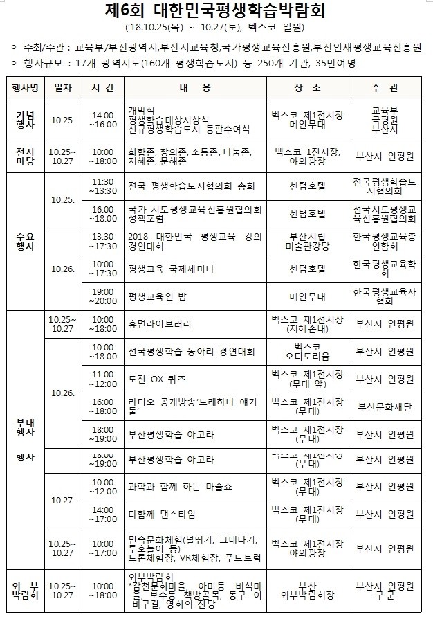 이번 박람회는 ‘평생학습, 사람을 빛나게 하다’라는 주제로 교육부가 주최하고 부산시와 국가평생교육진흥원·부산인재평생교육진흥원이 주관한다.