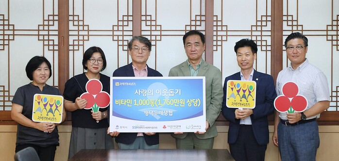 [로컬세계=김병민 기자] 경기 평택시는 예비사회적기업 평택두레소비자생활협동조합(이하 평택두레생협)이 지난 22일 평택시청 대외협력실에서 열린 사랑의 이웃돕기 전달식을 통해 1760만 원 상당의 비타민 1000통을 기부했다고 23일 밝혔다.