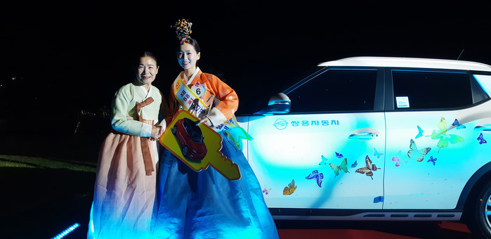 ▲지난 17일 열린 ‘전국춘향선발대회’ 본선에서 춘향 진(眞)의 영예를 안은 김진아씨(사진 오른쪽)와 시상자인 춘향제전위원장 안숙선 명창이 부상으로 주어진 티볼리 아머 앞에서 포즈를 취하고 있다.(쌍용차 제공) |