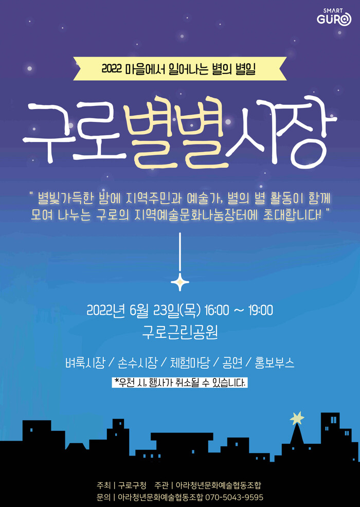 별별시장 행사는 이달 23일을 시작으로 11월까지 구로근린공원과 오류역 문화예술공원에서 매월 총 6회 열릴 예정이다. 개장 시간은 오후 4시부터 7시까지다.