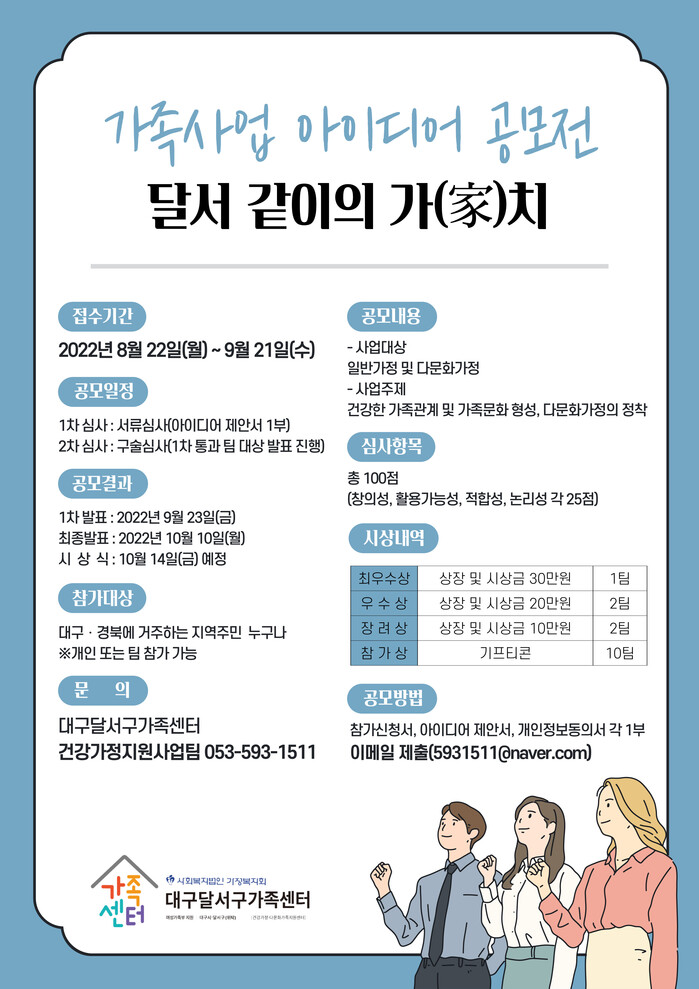 시상내역은 최우수상 1팀 30만원, 우수상 2팀 20만원, 장려상 2팀 10만원 외 참가상이 수여된다. 시상식은 10월 대구달서구가족센터에서 진행될 예정이다.