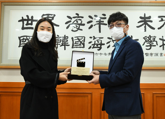 ▲부산영상위원회 감사패 전달식 에서 기념촬영을 하고 있다 왼쪽부터 부산영상위원회 양영주 제작지원팀장 도근영 한국해양대 기획처장 [한국해양대 제공] |