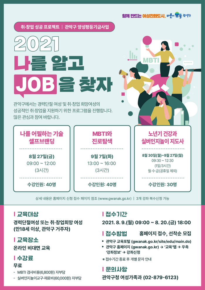 [로컬세계 임종환 기자]서울 관악구가 오는 20일까지 취·창업 성공프로젝트 ‘나를 알고 job을 찾자!’ 수강생을 모집한다.