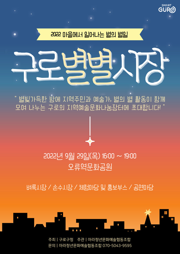 ‘별별시장’은 ‘마을에서 일어나는 별의별 일’이라는 뜻의 주민주도형 마을장터로 10월에는 구로근린공원, 11월에는 오류역문화공원에서 개최될 예정이다.