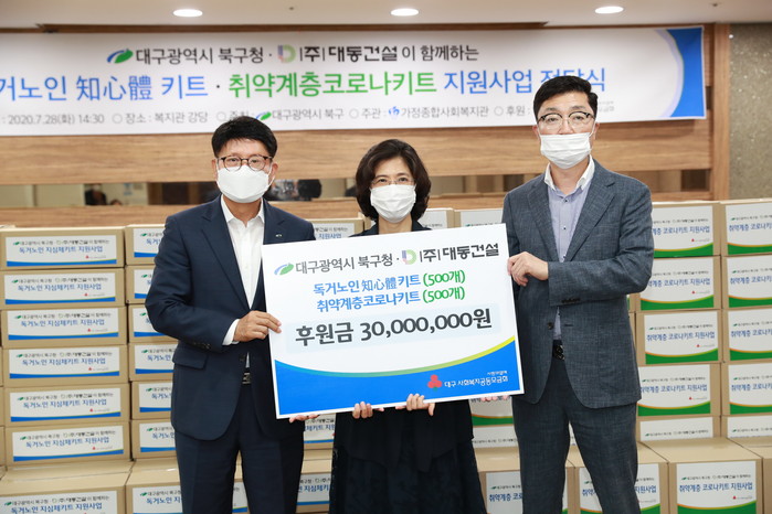 북구청은 ㈜대동건설(대표 서철수)이 지정기탁한 기부금 3000만원으로 코로나19로 오랜시간 사회와 단절돼 힘든 시간을 보내고 있는 독거노인과 저소득 계층을 위해 키트를 제작했으며, 독거노인 및 저소득계층 각 500세대에 전달할 예정이다.