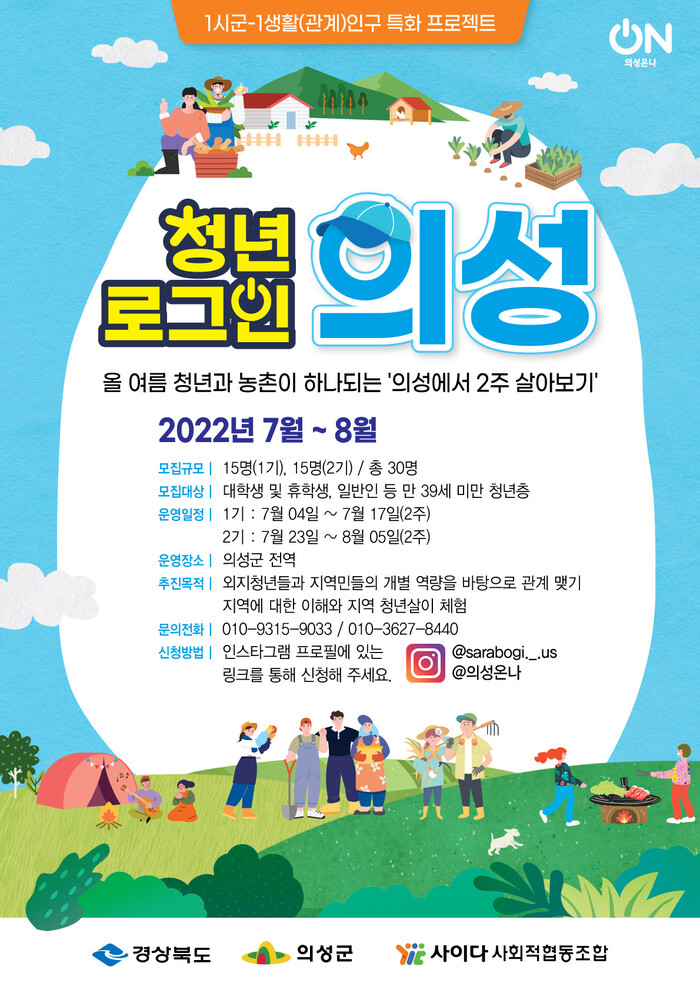 [로컬세계=박상진 기자]경북 의성군은 ‘1시군-1생활(관계)인구 특화 프로젝트: 의성ON나’의 첫번째 프로그램인 '청년 로그인 의성' 2기 참여자를 오는 7월 4일까지 모집한다고 29일 밝혔다.