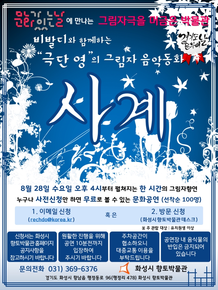 각 공연은 100명 선착순 모집하며, 화성시 향토박물관 1층 데스크를 방문하거나 홈페이지에서 신청서를 다운받아 이메일로 접수하면 무료로 관람할 수 있다.
