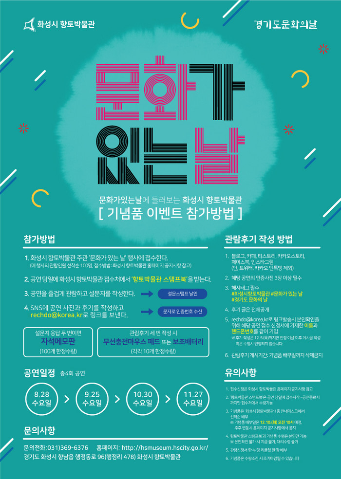 한편 화성시 향토박물관이 주관하는 ‘문화가 있는 날’ 무료 공연은 경기도 문화의 날인 매월 마지막 주 수요일 오후 4시에 열리고 있다.