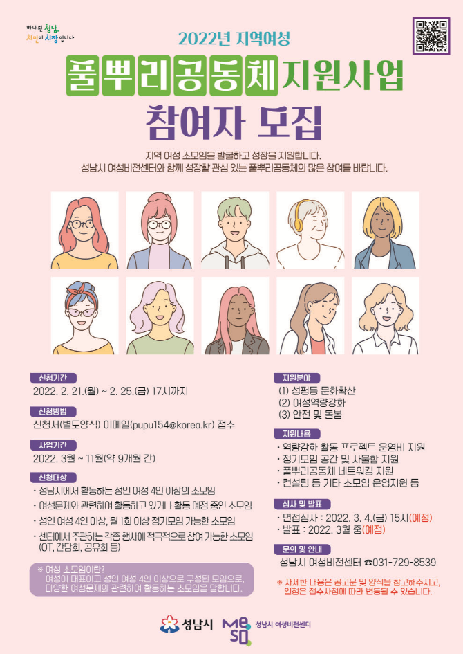 [로컬세계 김병민 기자]경기 성남시 여성비전센터는 지역 여성 소모임을 발굴하고 성장을 지원하기 위해 ‘2022년 지역여성 풀뿌리공동체 지원사업’ 참여자를 모집한다.
