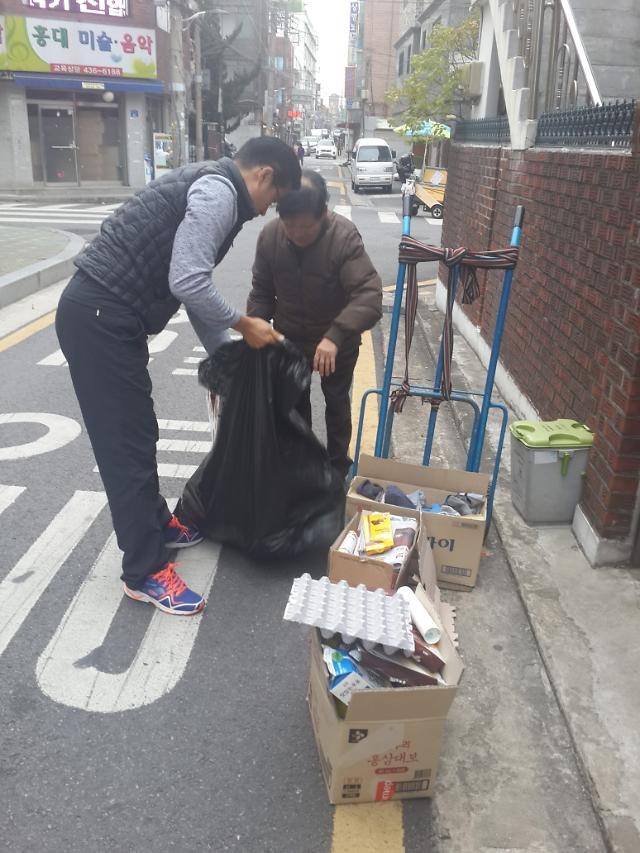 ▲불우한 어린시절을 극복하고 꿈을 이룬 이성식 소방장의 사연이 2019학년도 초등학교 5학년 도덕교과서에 실렸다. 사진은 중랑소방서 소속 이성식 소방장이 폐지수집으로 생계를 이어가는 할머니를 돕고 있다.(서울시 제공) |