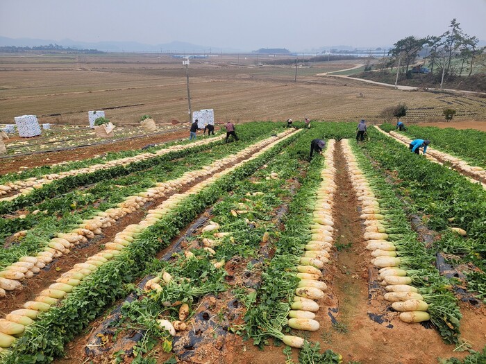 ▲ 전남 무안 포전에서 수매비축을 위한 무 수확 현장. aT 제공 |