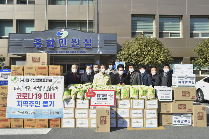 [로컬세계 박세환 기자]대구 남구청(구청장 조재구)은 지난 2일 (사)한국산림보호협회(회장 허태조)에서 코로나19 확산으로 어려움을 겪고 있는 지역주민을 위해 라면, 홍삼식초 등 1,500만원 상당의 생필품을 전달했다고 밝혔다.