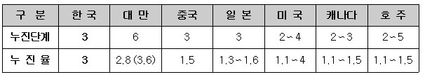 대만의 경우 누진단계 6단계/누진율 2.8배, 중국은 누진단계 3단계/누진율 1.5배, 캐나다는 누진단계 2∼3단계/누진율 1.1∼1.5배, 호주는 누진단계 2∼5단계/ 1.1∼1.5배로 정하고 있다.