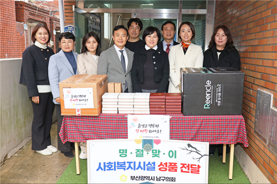 [로컬세계 부산=맹화찬 기자]부산 남구의회(의장 박미순)는 민족 최대의 명절인 설을 앞두고 지난 13일 관내 사회복지시설 두 곳을 찾아 각 150만원 상당의 지원 물품을 전달하고, 시설 종사자들을 격려했다고 16일 밝혔다.