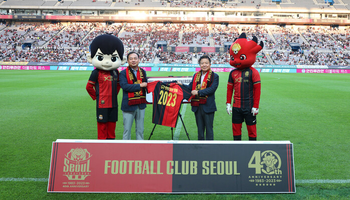 ▲2023시즌 유한양행과 FC서울이 파트너십을 맺고 있다. 사진 왼쪽 GS스포츠 여은주 대표, 오른쪽 유한양행 이병만 부사장 |