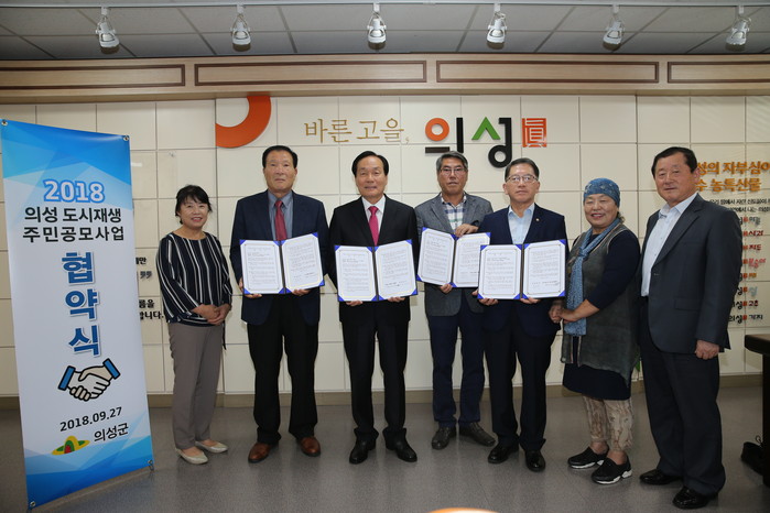 | ▲김주수 군수(왼쪽에서 세번째)는 지난달 27일 군청에서 ‘2018년 의성군 도시재생 주민공모사업’ 시행을 위한 협약식을 가졌다.(의성군 제공) |