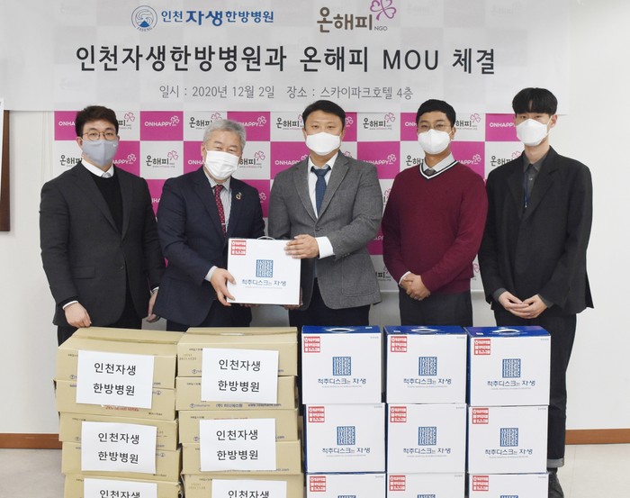 자생의료재단 인천자생한방병원(병원장 우인)은 지난 2일 NGO 단체 온해피와 지역 의료복지 증진을 위한 업무협약(MOU)를 체결하고, 독거노인을 위한 쌍화탕과 한방파스 총 1200개를 전달했다고 3일 밝혔다.