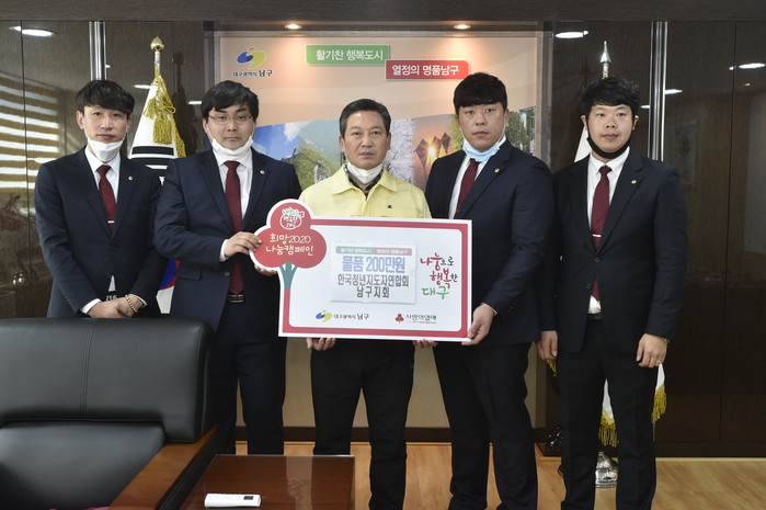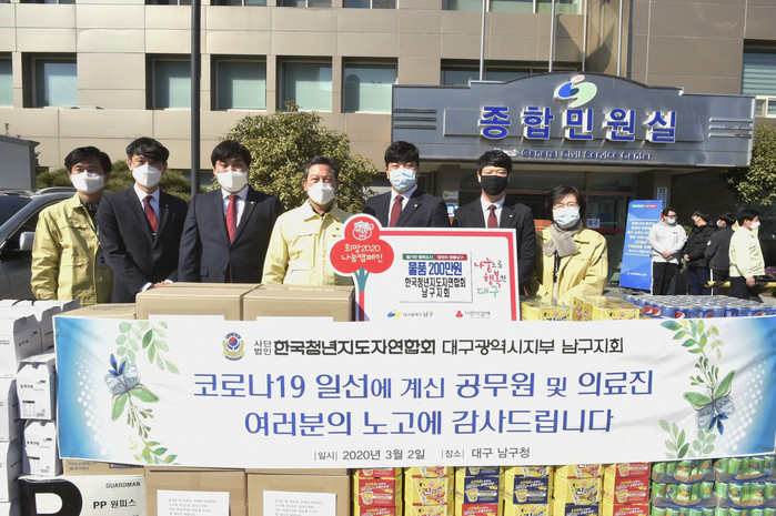 [로컬세계 박세환 기자]대구 남구청(구청장 조재구)은 지난 2일 한국청년지도자연합회 대구남구지회(회장 이상호)에서 코로나19 확산으로 최일선에서 불철주야 근무하는 대응직원 및 의료진을 위해 200만원 상당의 격려물품을 전달했다고 3일 밝혔다.