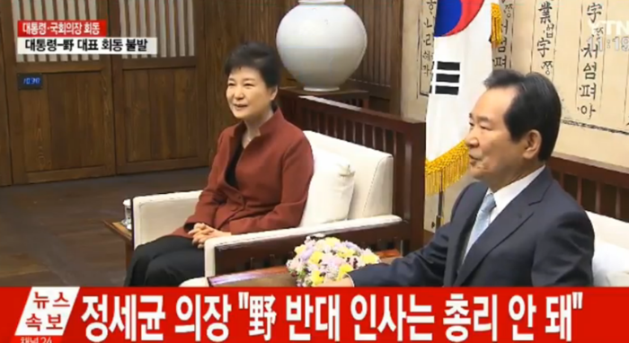 ▲박근혜 대통령과 정세균 국회의장이 회담을 갖고 있다. 사진은 YTN 화면 캡쳐. |
