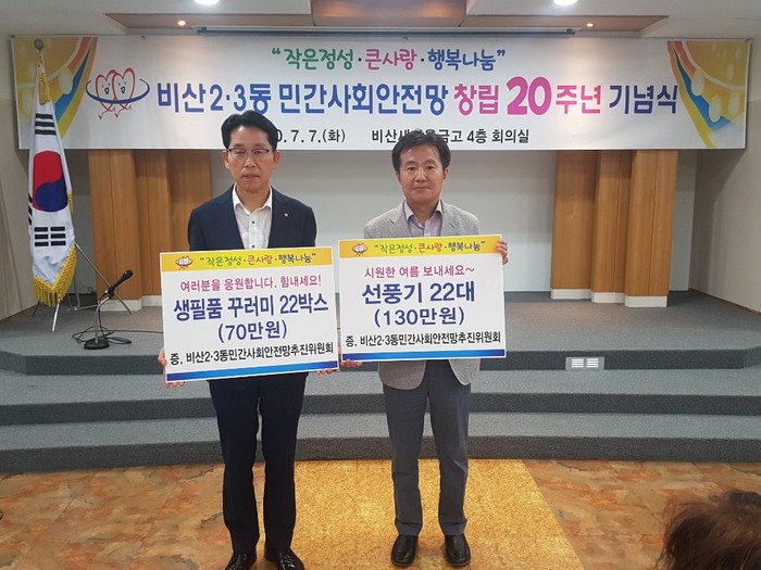 이날 기념식에서도 취약계층에게 지원할 선풍기 22대와 생필품꾸러미 22박스를 비산2.3동 행정복지센터에 전달했다.