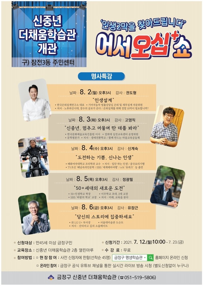 특강은 만 45세 이상 금정구민이 우선 참여할 수 있으며 오는 12일오전 10시부터 금정구평생학습관 누리집에서 신청할 수 있다. 기타 자세한 사항은 금정구 신중년 더채움학습관으로 문의하면 된다.