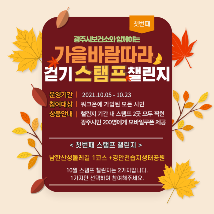 [로컬세계 김병민 기자]경기 광주시는 맑은 가을하늘과 함께하는 ‘10월에는 가을바람 따라 걷기(10월 스탬프 챌린지)’를 시행한다고 1일 밝혔다.