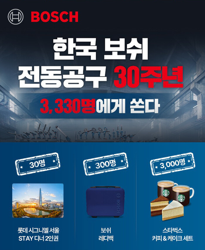 이번 이벤트는 보쉬의 전문가용 전동공구를 구매한 3,330명에게 △롯데 시그니엘 서울 STAY 디너 2인권 △보쉬 레디백 △스타벅스 커피 & 케이크 세트 등 3가지 경품을 각 30명, 300명, 3,000명에게 증정한다.