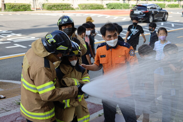 '미래소방관 체험교실'은 관내 초·중·고등학생을 대상으로 소방 역사, 조직, 채용절차 등 소방관 진로탐색과 특수방화복 착용, 소방장비 및 차량 소개, 연기소화기, 방수 체험 등 소방공무원에 대한 직업체험으로 구성됐다.