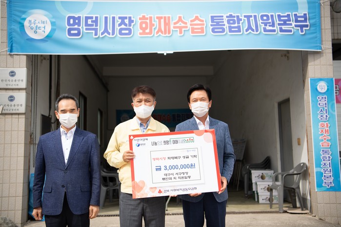 류한국 서구청장은 “코로나19로 인한 어려움에 화재까지 겹쳐 힘든 상황에 큰 금액은 아니지만 피해극복에 조금이라도 보탬이 되기 바라며, 영덕시장 상인들이 힘을 내어 다시 일어서기를 응원한다”고 말했다.