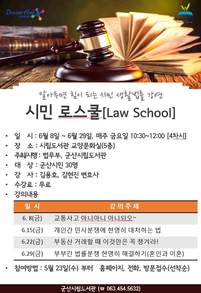 시민로스쿨은 군산시민이면 누구나 시립도서관 홈페이지 및 전화를 통해 신청 가능하며, 프로그램에 대한 자세한 내용은 군산시립도서관 홈페이지(lib.gunsan.go.kr)에서 확인할 수 있다.