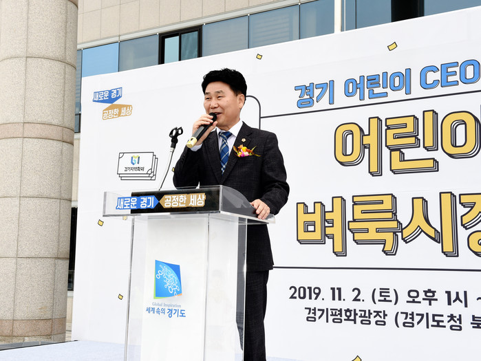 ▲김원기 경기도의회 부의장이 지난 2일, 경기도청 북부청사 내 경기평화광장에서 열린 ‘어린이 벼룩시장 개장식’에서 축사를 하고 있다.(경기도의회 제공) |