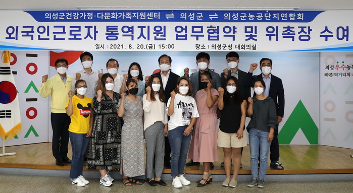 [로컬세계 박상진 기자]경북 의성군은 지난 20일 관내 외국인근로자의 원활한 언어 소통 지원을 위해 의성군건강가정다문화가족지원센터, 의성군농공단지연합회와 외국인근로자 통역지원에 관한 업무협약을 체결하고 다문화 이주여성들로 구성된 통역요원에게 위촉장을 수여했다고 23일 밝혔다.