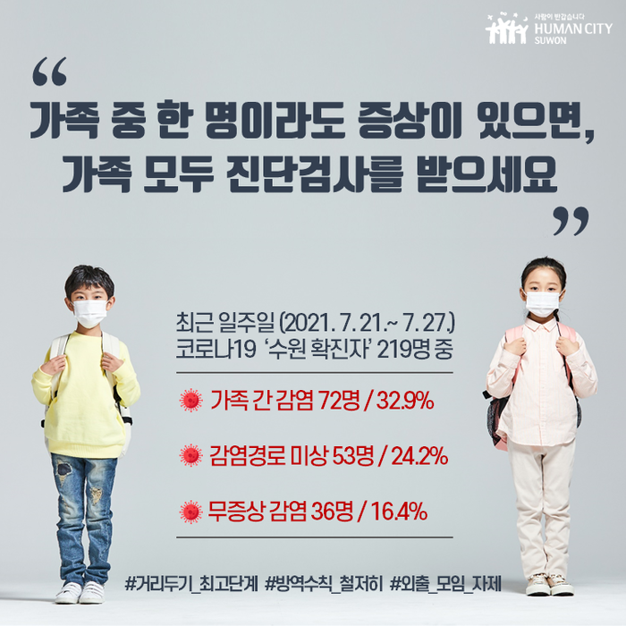 지난 21일부터 27일까지 수원시에서 발생한 코로나19 확진자는 219명인데, 그중 동거인을 포함한 ‘가족 간 감염’은 72명(32.9%)에 달했다. ‘감염경로를 알 수 없는 경우’가 53명(24.2%)이었다. 확진자 중 ‘무증상 감염자’는 36명(16.4%)였다.