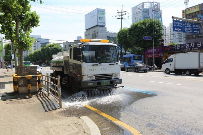 ▲도로물청소 용수로 재활용하여영등포구 물청소차량이 물청소. |