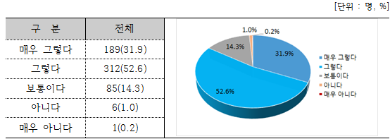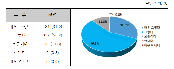 ‘홈페이지에 게시된 콘텐츠가 적절한지’에 대한 질문에 전체 응답자의 88.1% ‘매우 그렇다’ 또는 ‘그렇다’, ‘구성이 적절한지’에 대한 질문에는 87.8%가 긍정적으로 답했다.