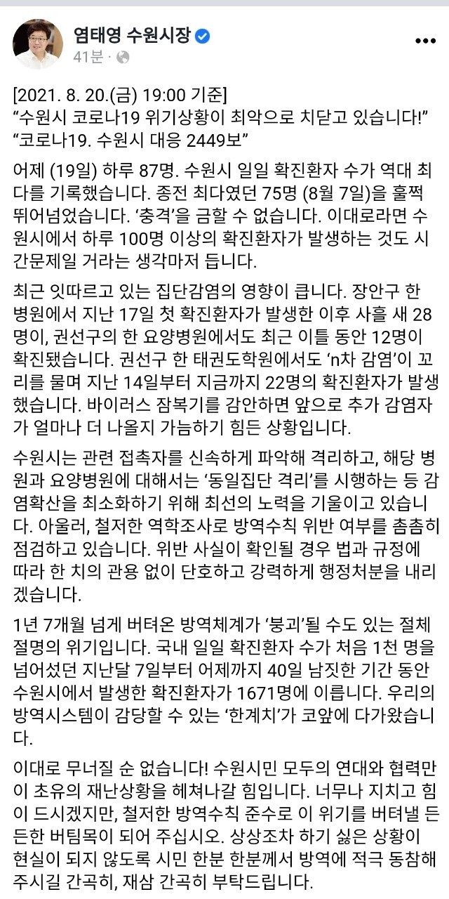 염태영 시장은 지난 20일 개인 SNS에 글을 게시하고, “19일 하루 동안 코로나19 확진자가 87명이 발생하는 등 수원시 코로나19 위기 상황이 최악으로 치닫고 있다”며 “철저한 역학조사로 방역수칙 위반을 촘촘히 점검하고, 위반 사실이 확인되면 단호하게 행정처분을 내릴 것”이라고 말했다.
