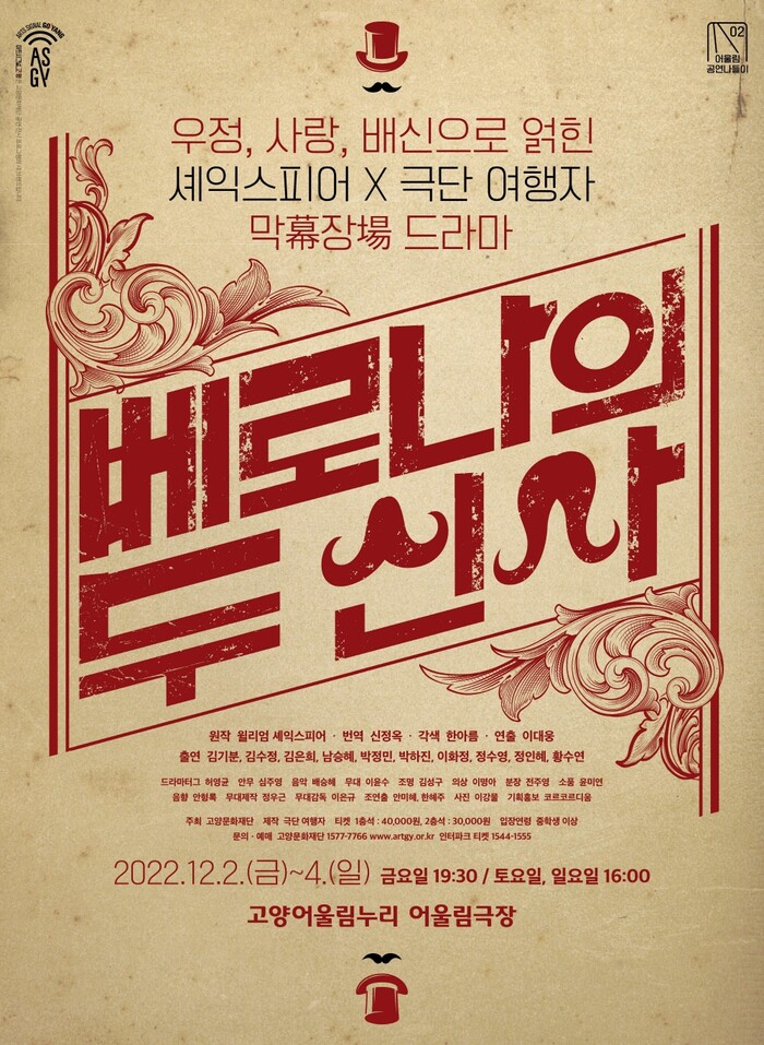 [로컬세계 = 이영원 기자]경기 고양문화재단은 2022 '어울림공연나들이 시리즈'의 두 번째 공연으로 연극 '베로나의 두 신사'를 12월 2일부터 4일까지, 3일간 고양어울림누리 어울림극장에서 선보인다.
